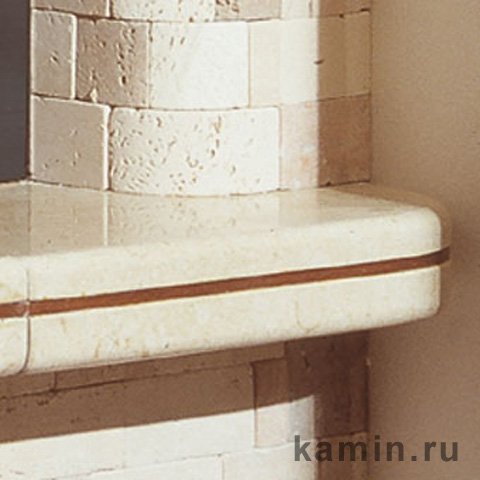 Угловая модель выполнена из мозаичного травертина разных оттенков, на плите из полированного стонелита цвета слоновой кости - деревянная вставка, балка из массива дерева.