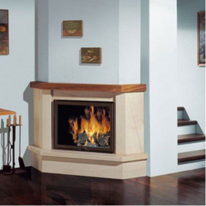 Угловая каминная облицовка из полированного бежевого мрамора с деревянной балкой.