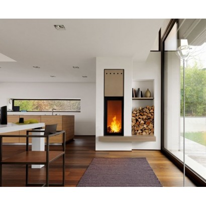 Высокая облицовка с цельной фронтальной панелью, банкеткой и полками из майолики ручной работы доступна в широком ассортименте цветов. Мраморная опора основания и стальная рамка с отделкой из черной эмали (на фотографии изображена модель Senape, высокая дровяная топка MA 266 SL).