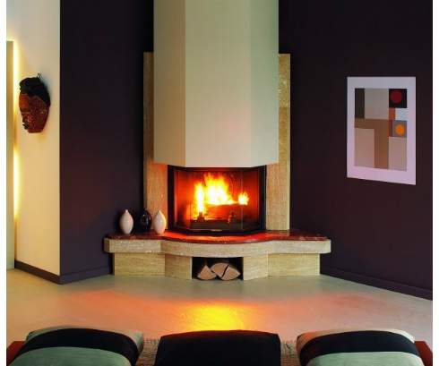 Угловой камин из кастилионского камня и полкой из красного скалистого мрамора.